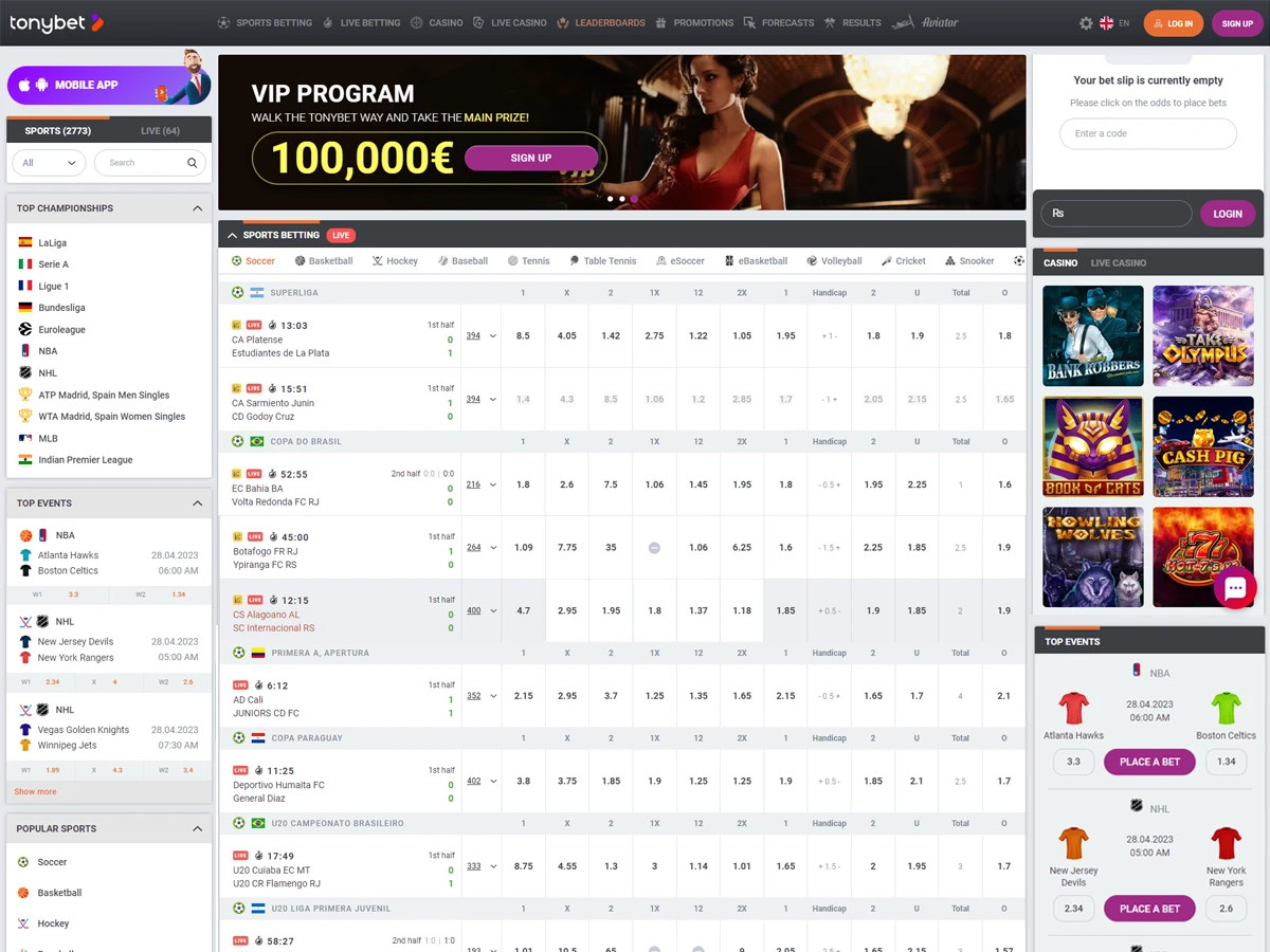 - Sports: TonyBet offers a wide range of sports, all of which have numerous competitions. Besides, big competitions like the NBA, Champions League or FIFA World Cup, small local championships are also available.