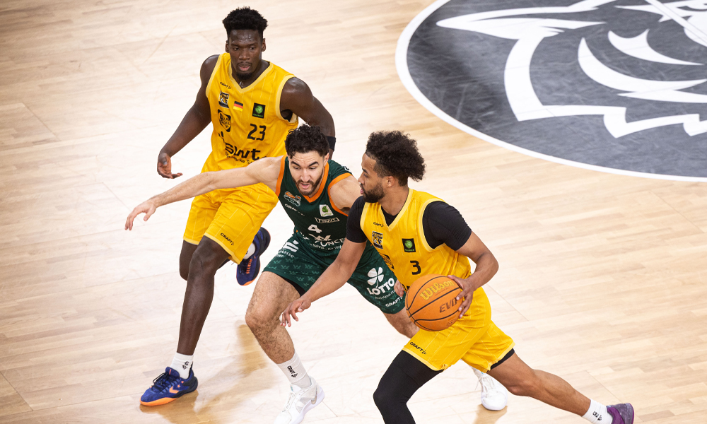 Verteilen fleißig Assists: Daniel Kirchner, Bjarne Kraushaar und Elijah Miller (Fotos: Swen Pförtner, Nathalie Zweifel, Paderborn Baskets).
