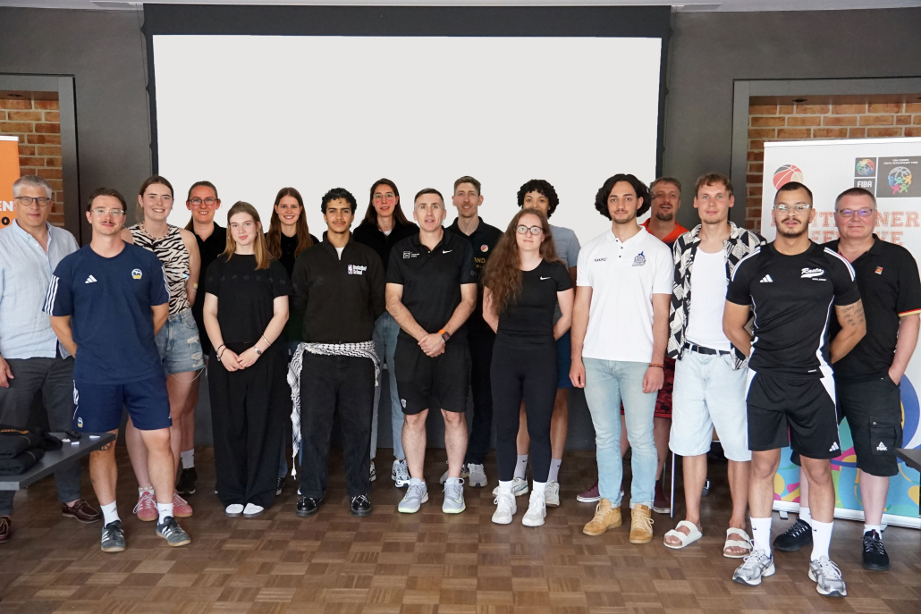 Am spielfreien Samstag der FIBA Women’s EuroBasket in Hamburg startete im Haus des ETV Hamburg die Minitrainer-Offensive (MTO) in den elften Durchgang. 16 Studierende aus ganz Deutschland beginnen damit die einjährige Ausbildung von DBB und Deutschem Basketball Ausbildungsfonds. Zur Begrüßung dankte DBB-Vizepräsident Stefan Raid den Teilnehmenden für ihr Interesse und ihre Bereitschaft sich im Minibasketball zu engagieren. Er betonte dabei die Schnittstelle zur Grundschulinitiative „15.000 Grundschulen“ und die wichtige Rolle, die die Minitrainer:innen in diesem Projekt spielen. Als drittes Handlungsfeld neben Mini- und Grundschulbasketball ergänzte DBB-Jugendsekretär Tim Brentjes das Thema Mädchenbasketball. Gerade vor dem Hintergrund der Dekadenstrategie „Time For Her Game“ freut sich das Organisationsteam sehr darüber, dass das Programm erstmalig gleichermaßen mit je acht Trainerinnen und Trainern besetzt werden konnte.