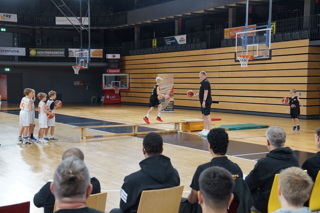 Begrüßt wurde die neue Generation von Vechtas Sportdirektor Gerrit Kersten-Thiele und Danny Traupe-Busch, Geschäftsführer des Niedersächsischen Basketballverbandes, die im VIP-Bereich des RASTA-Domes die Teilnehmenden am Standort begrüßten und den Lehrgang eröffneten. Anschließend folgte Jürgen Maaßmann (BBW/ALBA Berlin), der mit einer Spieleaufgabe in die Praxis einführte und gemeinsam mit Sportpsychologe Franz Rupprecht den Block „Minitrainer meets Entwicklungsphase“ gestaltete.