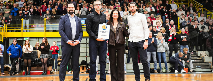 Die offizielle Ehrung nahmen Schirmherrin Maja Grothe, Matthias Sonnenschein (Leiter Sport- und Nachwuchsentwicklung easyCredit BBL) sowie Christian Krings (Geschäftsführer BARMER 2. Basketball Bundesliga) im Rahmen des ProA-Heimspiels der Paderborn Baskets gegen die VfL SparkassenStars Bochum am vergangenen Samstag vor.